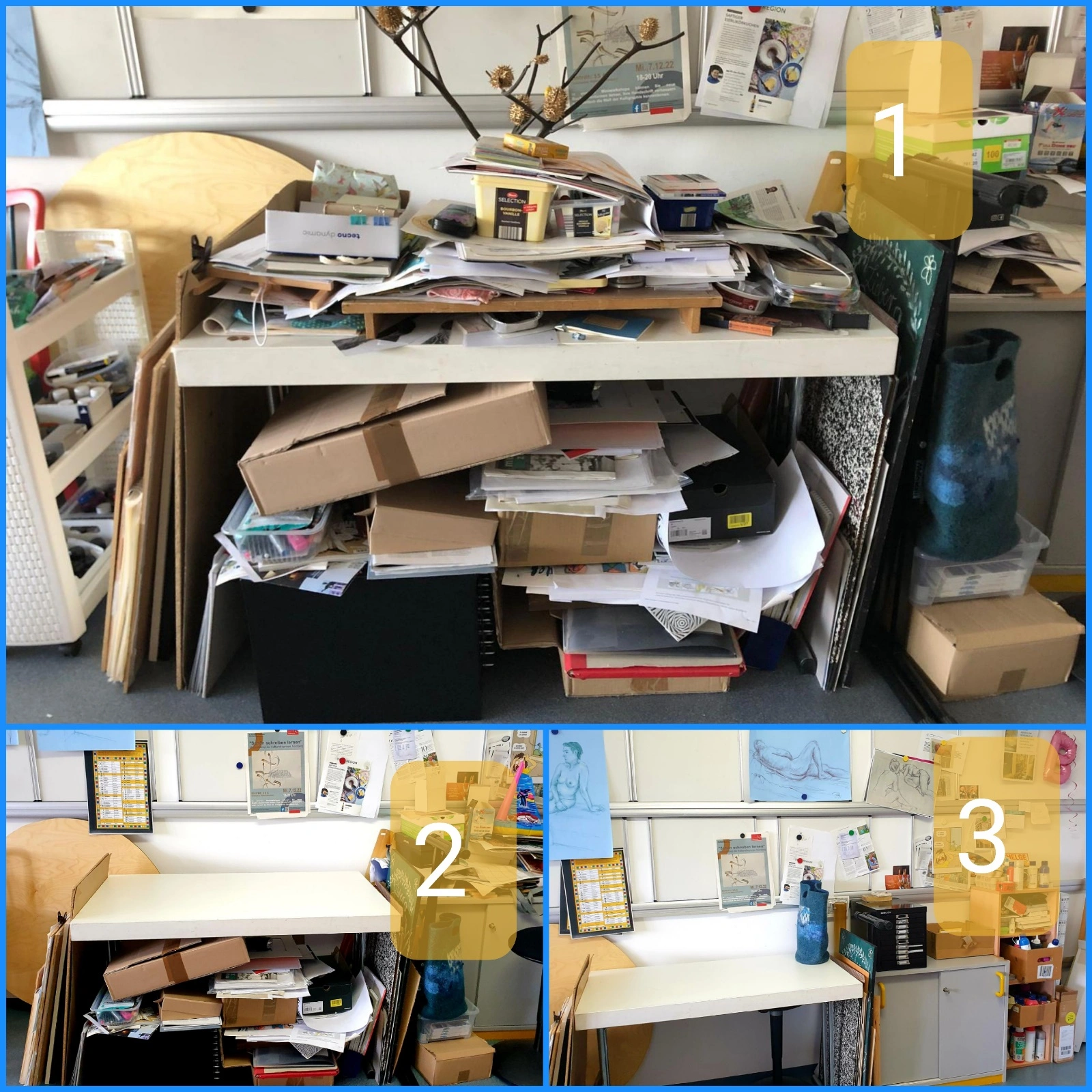 Ines ist Lehrerin und sie wünscht sich ein Büro, das endlich funktional ist. Sie fühlt sich von den vielen Dingen erschlagen und ertappt sich dabei, vor großen Korrektur-Projekten erst einmal Dinge von A nach B zu schieben, bevor sie überhaupt anfangen kann, konzentriert zu arbeiten.